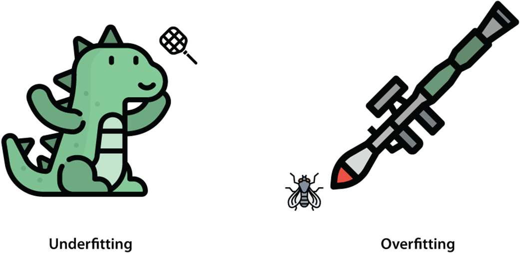 Underfitting and overfitting are two problems that can occur when training our machine learning model. Left: Underfitting happens when we oversimplify the problem at hand, and we try to solve it using a simple solution, such as trying to kill Godzilla using a fly swatter. Right: Overfitting happens when we overcomplicate the solution to a problem and try to solve it with an exceedingly complicated solution, such as trying to kill a fly using a bazooka.
