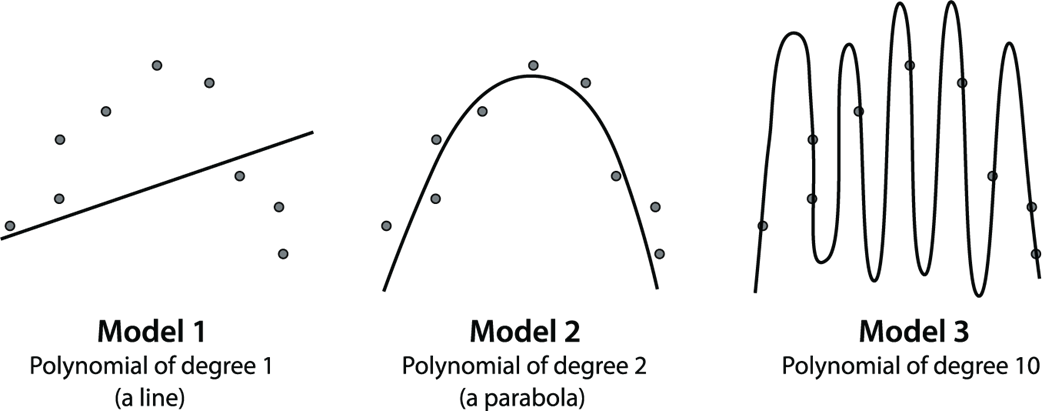 Fitting three models to the same dataset. Model 1 is a polynomial of degree 1, which is a line. Model 2 is a polynomial of degree 2, or a quadratic. Model 3 is a polynomial of degree 10. Which one looks like the best fit?