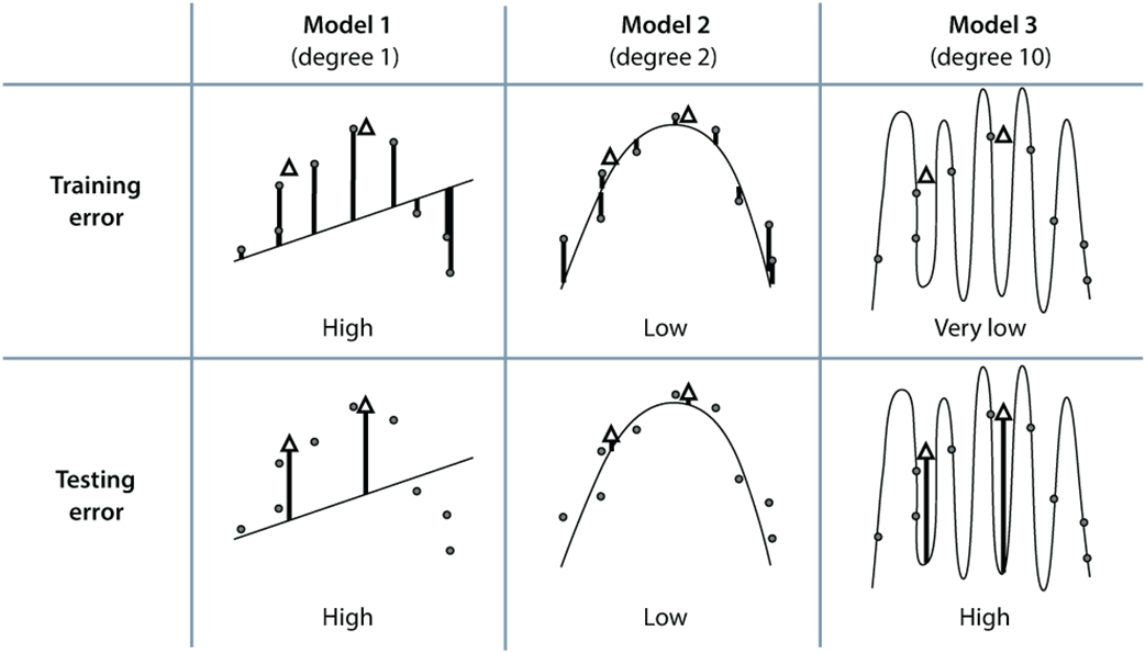 We can use this table to decide how complex we want our model. The columns represent the three models of degree 1, 2, and 10. The rows represent the training and the testing error. The solid circles are the training set, and the white triangles are the testing set. The errors at each point can be seen as the vertical lines from the point to the curve. The error of each model is the mean absolute error given by the average of these vertical lengths. Notice that the training error goes down as the complexity of the model increases. However, the testing error goes down and then back up as the complexity increases. From this table, we conclude that out of these three models, the best one is model 2, because it gives us a low testing error.