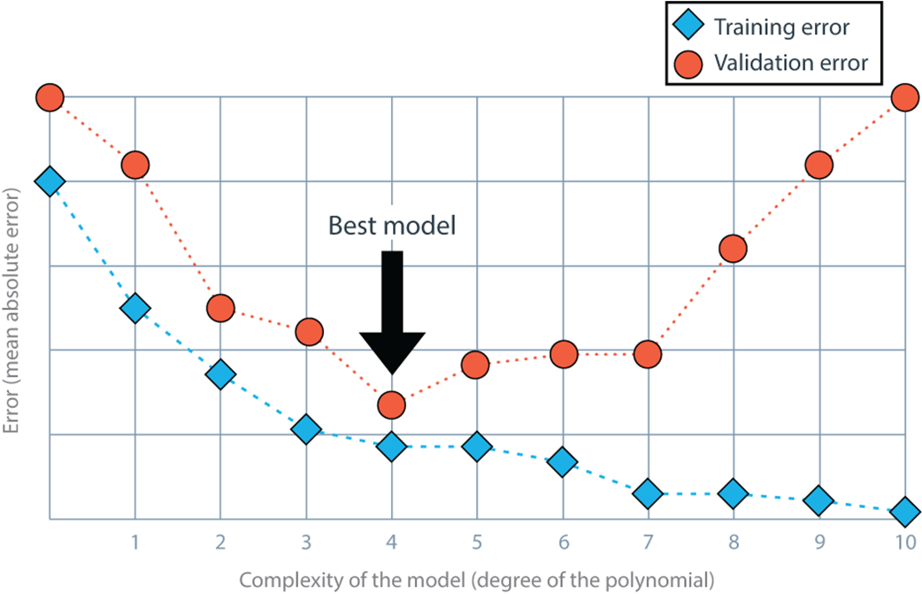 The model complexity graph is an effective tool to help us determine the ideal complexity of a model to avoid underfitting and overfitting. In this model complexity graph, the horizontal axis represents the degree of several polynomial regression models, from 0 to 10 (i.e., the complexity of the model). The vertical axis represents the error, which in this case is given by the mean absolute error. Notice that the training error starts large and decreases as we move to the right. This is because the more complex our model is, the better it can fit the training data. The validation error, however, starts large, then decreases, and then increases again—very simple models can’t fit our data well (they underfit), whereas very complex models fit our training data but not our validation data because they overfit. A happy point in the middle is where our model neither underfits or overfits, and we can find it using the model complexity graph.