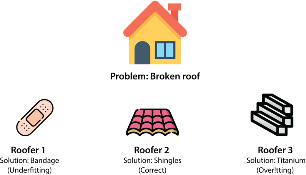 An analogy for underfitting and overfitting. Our problem consists of a broken roof. We have three roofers who can fix it. Roofer 1 comes with a bandage, roofer 2 comes with roofing shingles, and roofer 3 comes with a block of titanium. Roofer 1 oversimplified the problem, so they represent underfitting. Roofer 2 used a good solution. Roofer 3 overcomplicated the solution, so they represent overfitting.