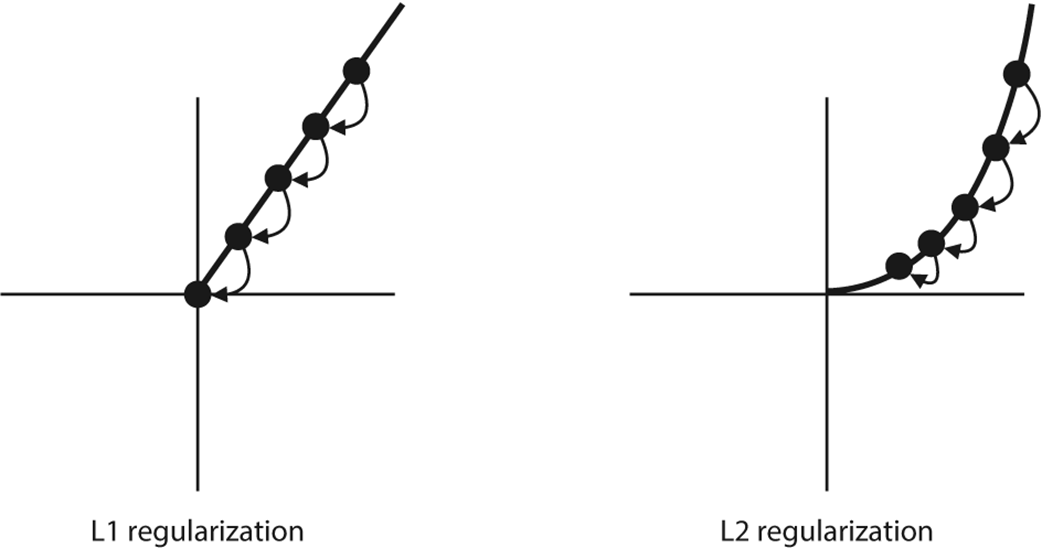 Both L1 and L2 shrink the size of the coefficient. L1 regularization (left) does it much faster, because it subtracts a fixed amount, so it is likely to eventually become zero. L2 regularization takes much longer, because it multiplies the coefficient by a small factor, so it never reaches zero.