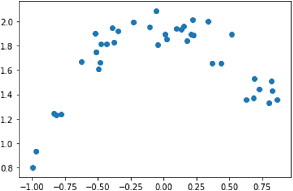 The dataset. Notice that its shape is a parabola that opens downward, so using linear regression won’t work well. We’ll use polynomial regression to fit this dataset, and we’ll use regularization to tune our model.