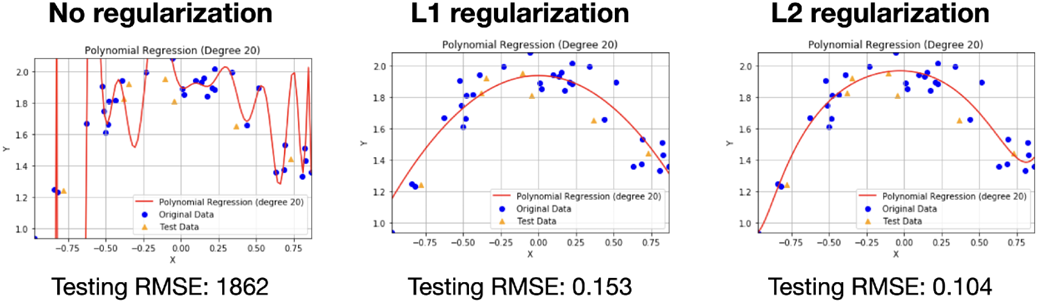 Three polynomial regression models for our dataset. The model on the left has no regularization, the model in the middle has L1 regularization with a parameter of 0.01, and the model on the right has L2 regularization with a parameter of 0.01.