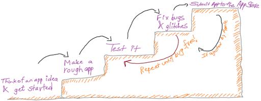 Next, it clarifies what makes an app and what makes a good one—clear visuals, simple and readable design, responsiveness, usefulness, and reliability. You learn the essence of programming as giving step‑by‑step instructions (code) that computers execute precisely, excelling at math and repetitive tasks. The chapter maps the idea‑to‑app cycle: prototype, test, fix bugs, iterate, and submit to the App Store—persevering through feedback until your app is accepted.