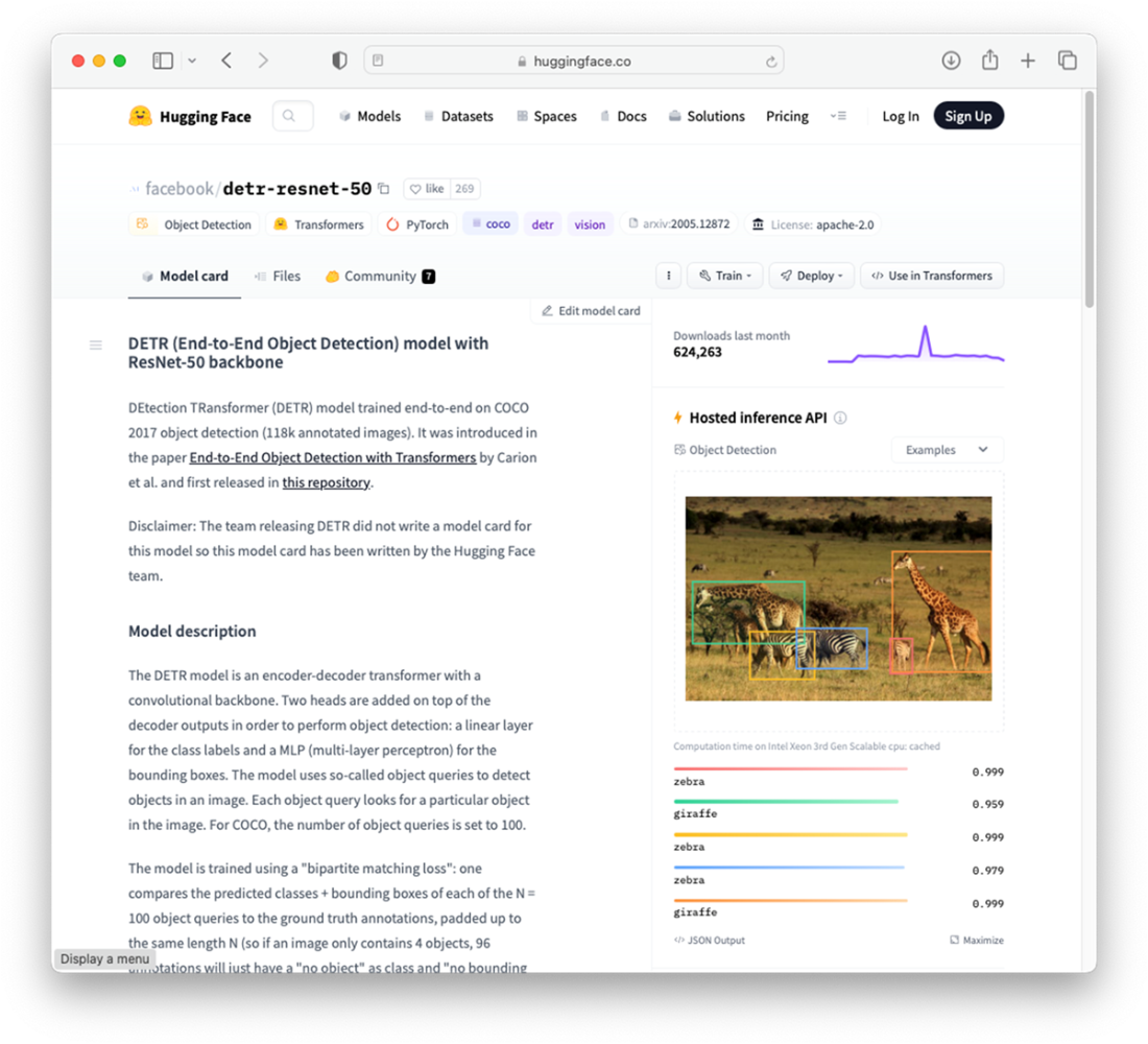 The Hosted Inference API lets you test and run models via simple HTTP requests or directly in the browser using built-in widgets—no setup required. It’s ideal for quick evaluation, demos, or production scenarios where you prefer managed infrastructure that auto-scales.How can I try and then use the facebook/detr-resnet-50 object detection model?