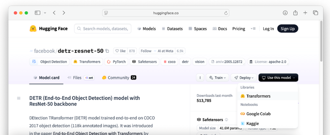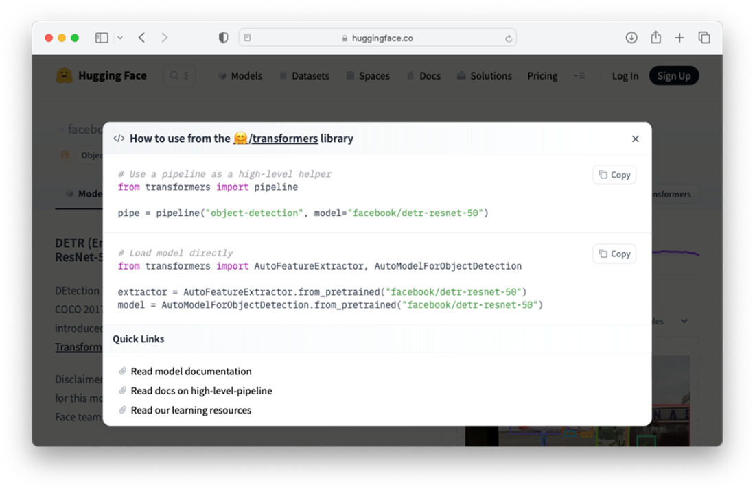 - In-browser: Open the model page, drag-and-drop an image, and view detected objects with confidence scores using the Hosted Inference API.- In code: Click “Use in Transformers” on the model page to copy sample code, then run an object-detection pipeline with model="facebook/detr-resnet-50".