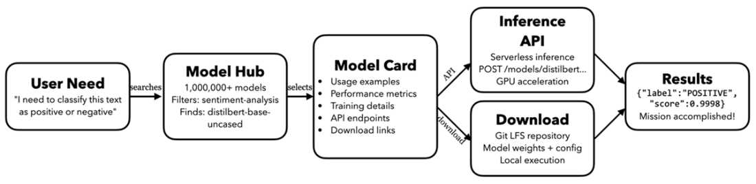 - Step 1: User need (e.g., classify sentiment, translate text).- Step 2: Discover a model on the Model Hub using search and filters.
