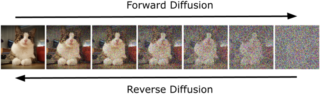 - Forward Diffusion: incrementally corrupts data by adding noise, moving from structure to noise (x0 → xT).- Reverse Diffusion: learns to remove noise step by step, moving from noise to structure (xT → x0) to reconstruct or synthesize coherent images.