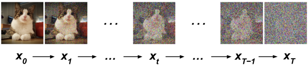 The Forward Diffusion process gradually adds noise to an original image x0 over T timesteps, producing increasingly noisy versions xt until the data becomes indistinguishable from random (Gaussian) noise at xT. This controlled corruption defines a path the model later learns to reverse.Why do we add noise during Forward Diffusion?