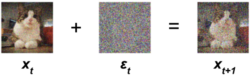 Illustration of the noise addition step in a single step t in during the Forward Diffusion phase, transforming image xt into xt+1 by adding the noise εt.