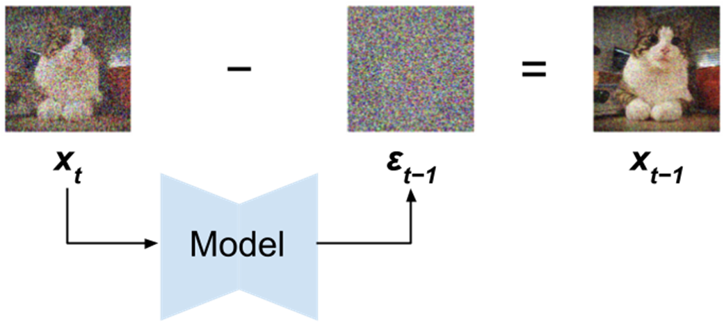Illustration of noise removal via Reverse Diffusion. Given a noisy image xt, the Reverse Diffusion model learns to predict εt-1. By subtracting this noise, the model aims to recover the previous image state, xt-1.