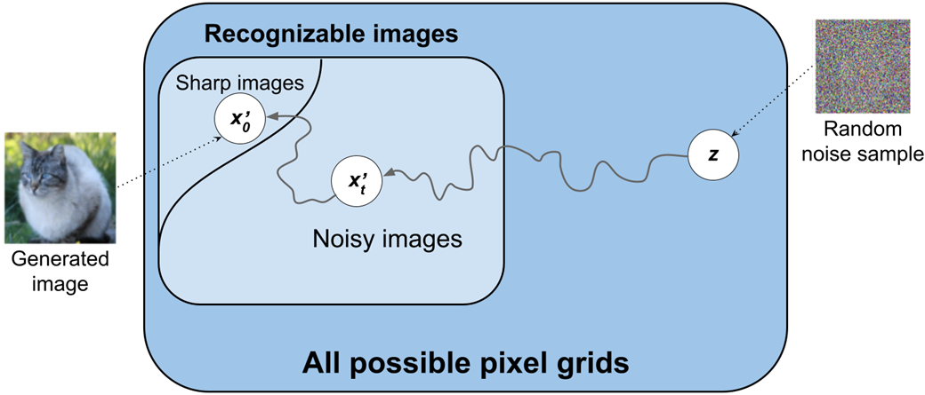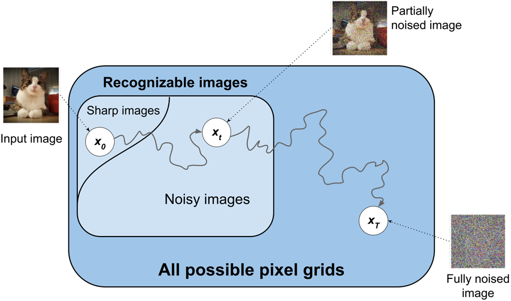 Conceptual illustration of Diffusion in the pixel space. Diffusion Models learn the complex distribution of real images by first adding noise to these images and then learning to reverse this process. Through training, they effectively map the journey from disorder (random noise) to order (structured, recognizable imagery).