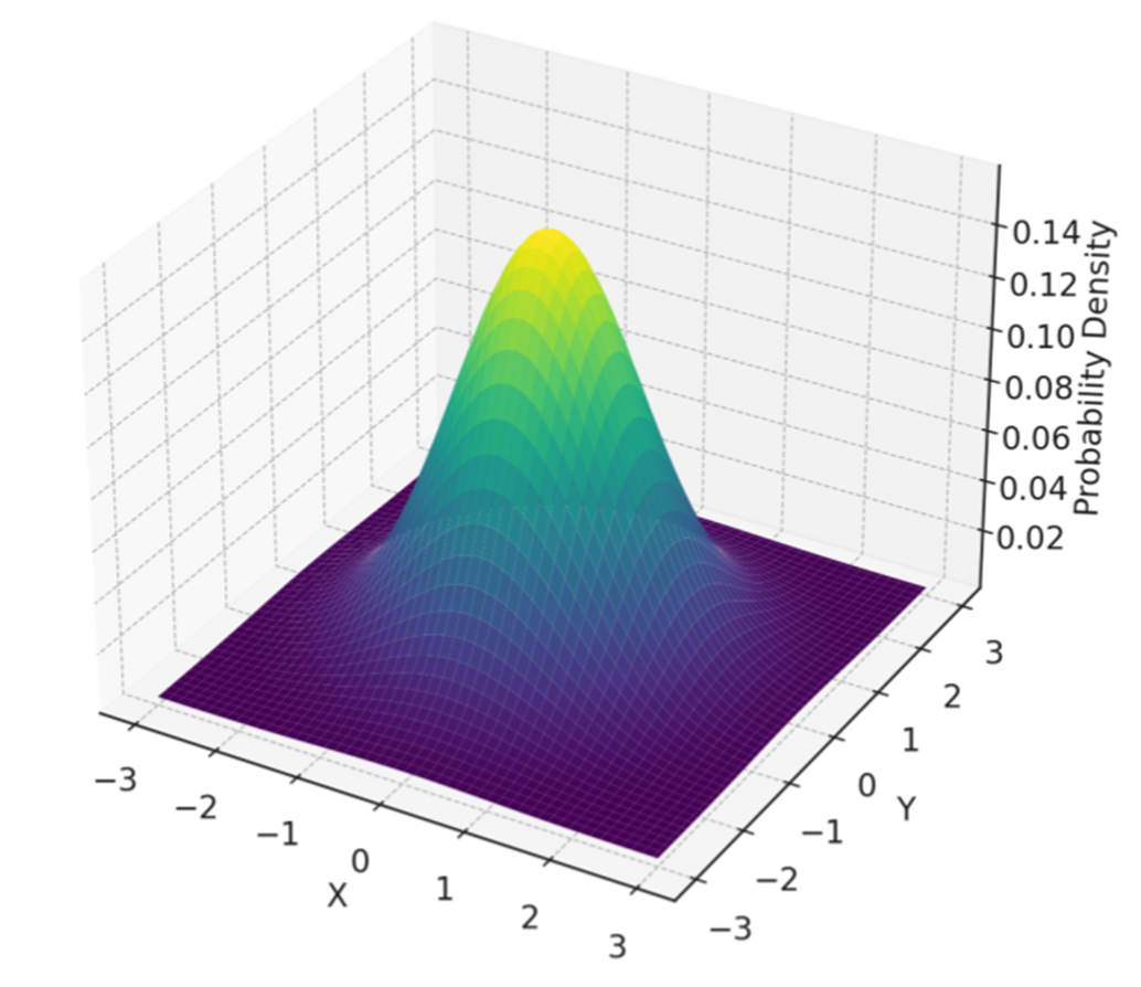 Isotropic Gaussian distribution over 2-dimensions. Characteristic of an Isotropic Gaussian, the distribution exhibits uniform variance in every direction, manifesting in a perfectly symmetrical shape around its mean. This uniformity implies that the data points spread out from the center with equal probability in all planar directions, exhibiting isotropy.