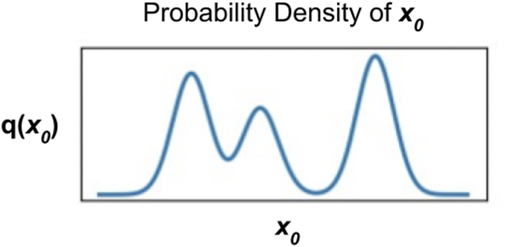 [2] Probability density function of 1D data. This figure shows a Probability Density Function (PDF) for 1D data, with the x-axis representing the data coordinates and the y-axis indicating probability density. A complex, multimodal (having multiple peaks) distribution exemplifies how certain x-coordinates are more likely to host data points, based on the peak heights. That is, the higher the PDF curve denoted as q(x0), the more likely it is that a randomly sampled datapoint would have an x-coordinate near the peak.