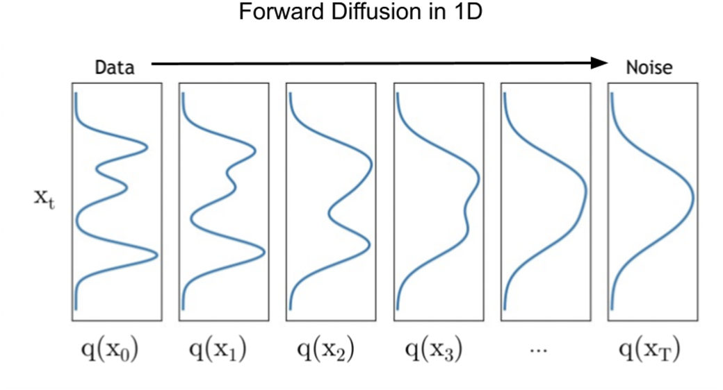 [3] Evolution of 1D data distribution via Forward Diffusion. This figure illustrates the transformation of the input data’s probability density, q(x0), into a Standard Normal Distribution, q(xT) via Forward Diffusion. It illustrates the progressive smoothing of the original data distribution’s characteristics through gradual Gaussian noise addition until they align with those of a Gaussian distribution.
