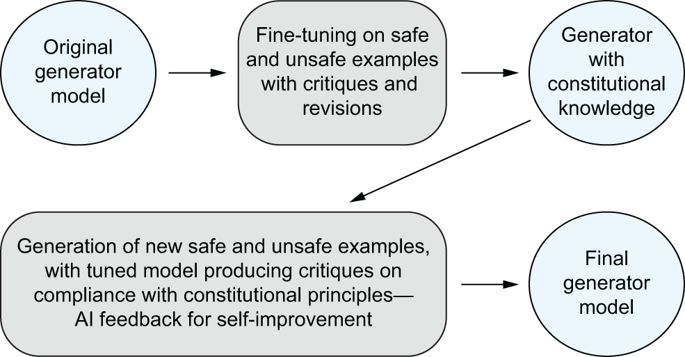 Constitutional AI encodes a set of principles (a “constitution”) and uses an AI critic to prefer responses that comply with those principles. The critic provides feedback that guides the generator model during post-training, reducing reliance on large-scale human labeling. It can scale safety alignment while lowering exposure of human moderators to harmful content.