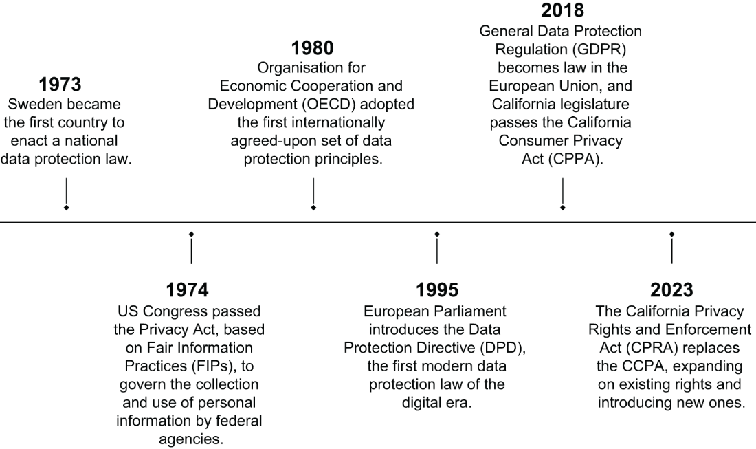 Legally and organizationally, the chapter traces privacy frameworks from early Fair Information Practices and OECD principles to modern regimes like GDPR, Brazil’s LGPD, and China’s PIPL, contrasting them with the United States’ sectoral and state-based approach (e.g., CCPA/CPRA). It reviews recent enforcement and scrutiny around generative AI, including questions about lawful bases for processing, transparency, children’s access, and the feasibility of rights like erasure once data is embedded in model weights. Complementary instruments—the EU AI Act, the Digital Services Act, product liability and cybersecurity rules—and sectoral protections such as FERPA expand oversight. Companies respond with privacy-by-design practices, PETs, enterprise safeguards, and documentation (dataset/model cards, data nutrition labels), though maturity varies. The chapter closes by emphasizing that compliance is a baseline: robust, lifecycle governance grounded in transparency, accountability, fairness, and human rights is essential—and users should remain cautious and informed about how their data is collected and used.