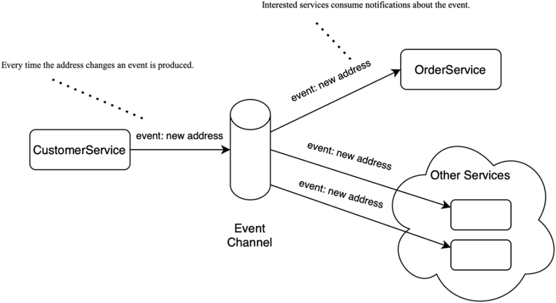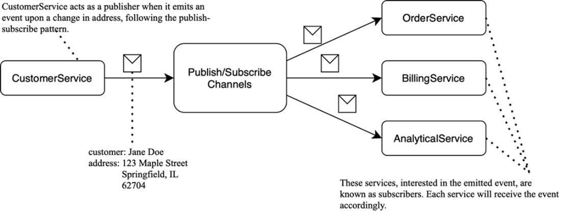 Publish-subscribe example: CustomerService publishes a “customer updated” event to a channel; all subscribers receive it independently.