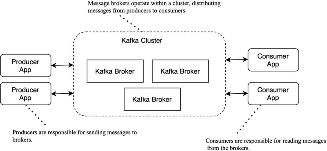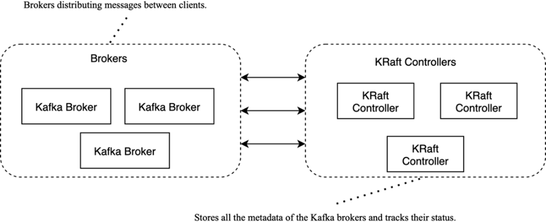 Structure of a Kafka cluster: brokers handle client traffic; KRaft controllers manage metadata and coordination