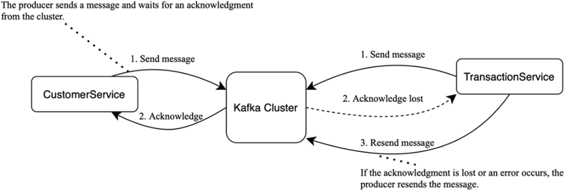Acknowledgments: Once the cluster accepts a message, it sends an acknowledgement to the service. If no acknowledgment arrives within the timeout, the service treats the send as failed and retries.