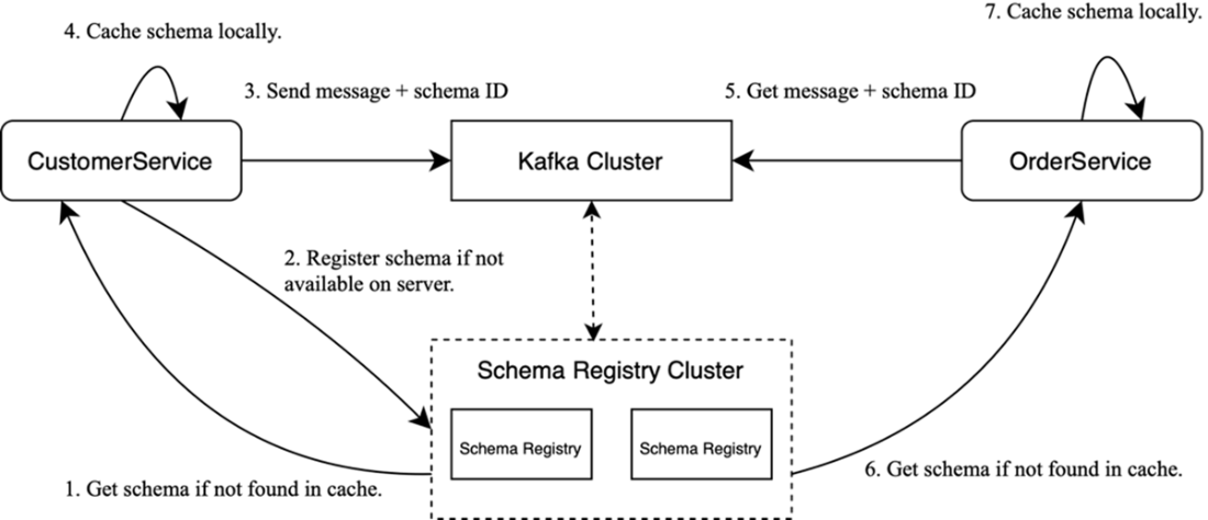 Working with Schema Registry: Schemas are managed by a separate Schema Registry cluster; messages carry only a schema ID, which clients use to fetch (and cache) the writer schema.