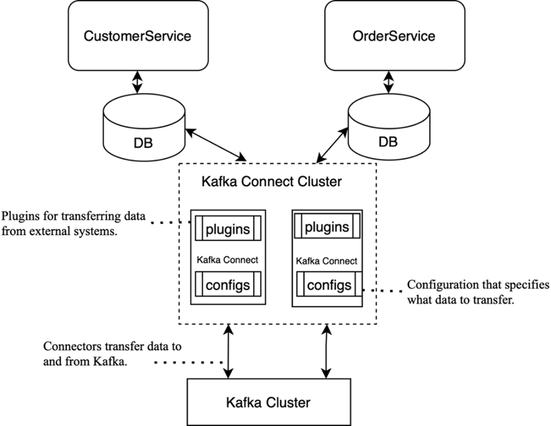 The Kafka Connect architecture: connectors integrate Kafka with external systems, moving data in and out.