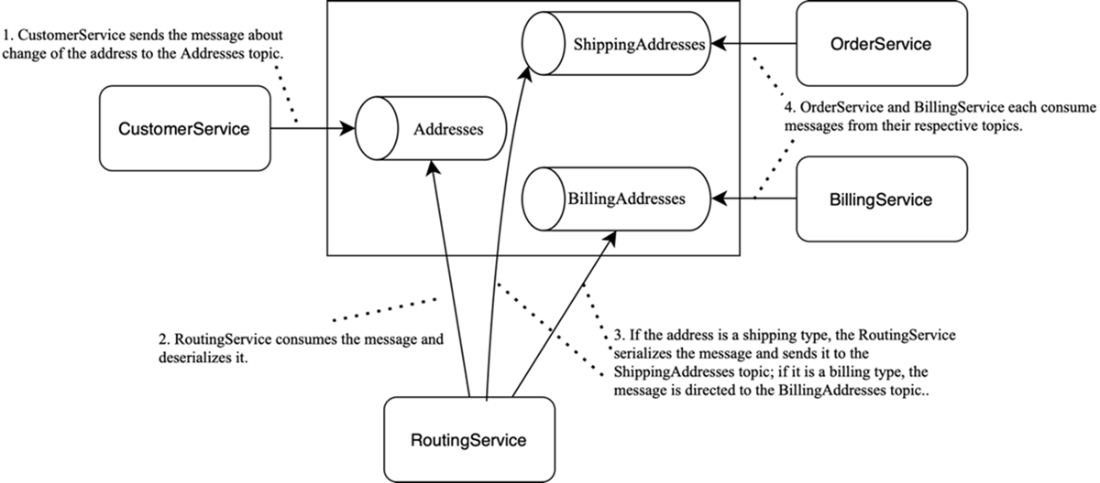 An example of a streaming application. RoutingService implements content-based routing, consuming messages from Addresses and, based on their contents (e.g., address type), publishing them to ShippingAddresses or BillingAddresses.