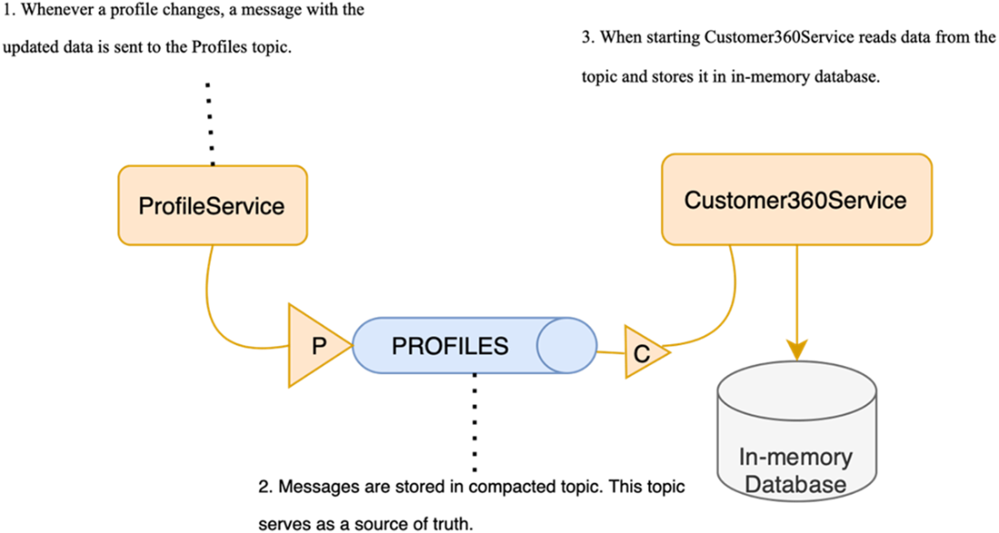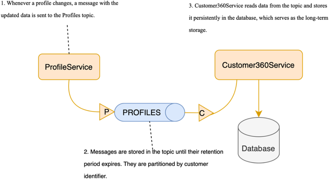 Flow diagram illustrating how ProfileService sends notifications about profile changes to Customer360Service through Kafka