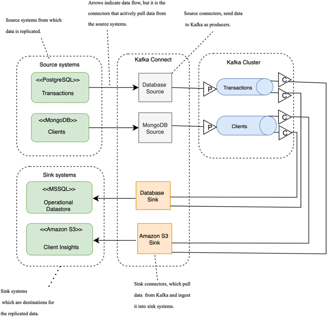 - Data replication can be implemented using Kafka Connect, a key component of the Kafka ecosystem. Kafka Connect provides a flexible and scalable way to implement data replication without extensive custom development.