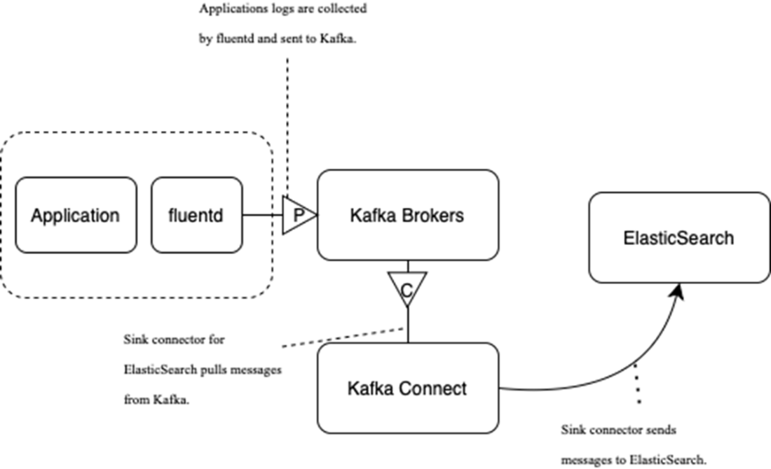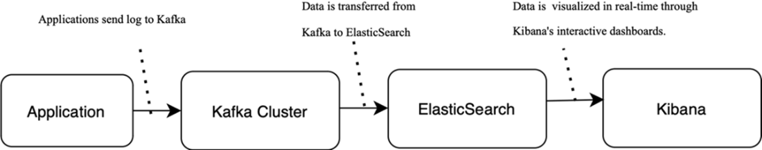 Conceptual flow for log data collection: Log data is sent from the application to Kafka for processing, it’s then indexed in Elasticsearch, and it’s finally visualized in Kibana.