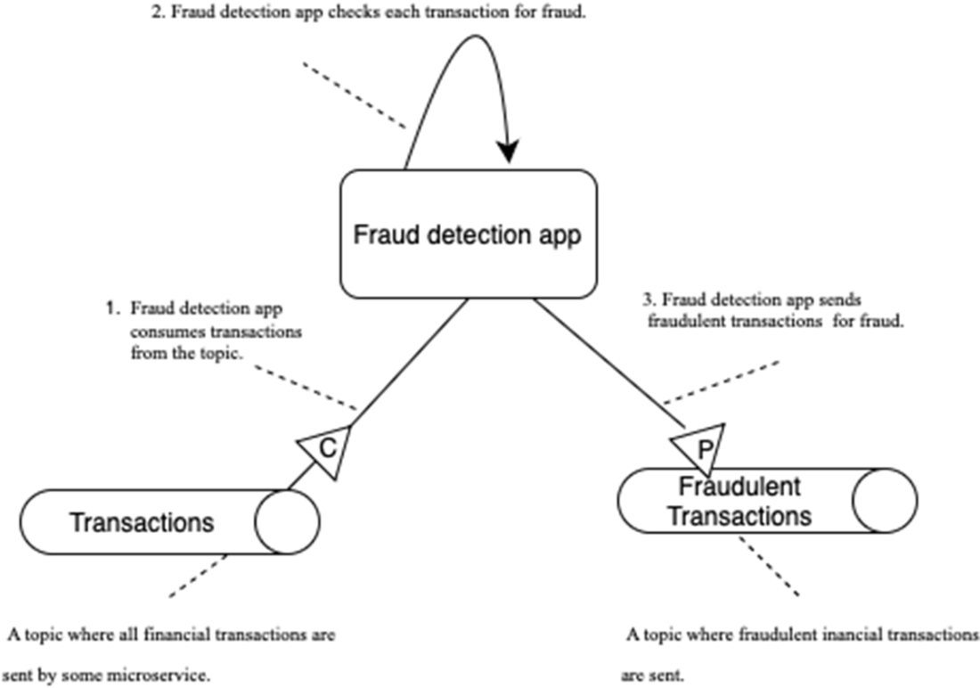The fraud detection application acts as a producer and a consumer for Kafka topics. It reads messages from the Transactions topic, processes them, and sends the output results to the Fraudulent Transactions topic.
