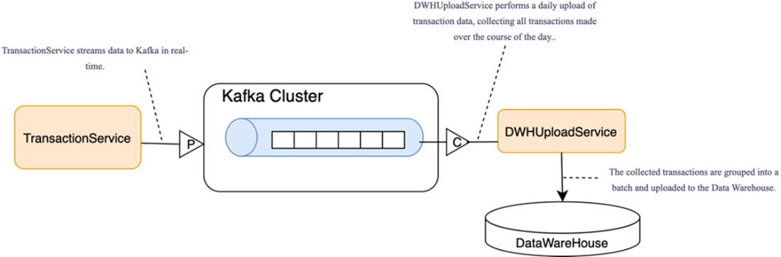 Time-based batch load to the data warehouse: the consumer buffers records and, at fixed intervals, bulk-loads a batch to the data warehouse (rather than per-message processing).