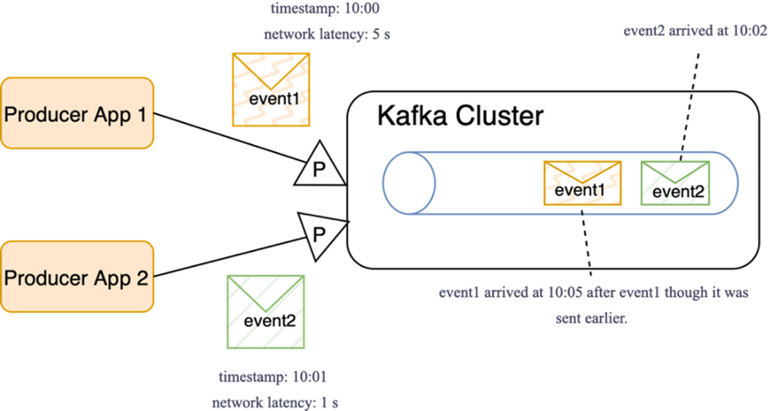 Unexpected ordering. Earlier-timestamped messages can arrive later because of network delays.