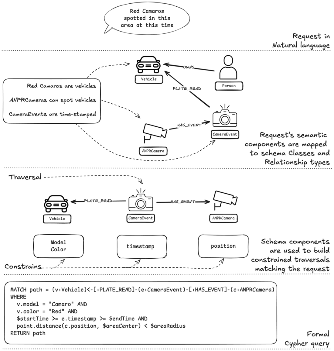 Translation Process from Natural Language to Cypher Query. This diagram illustrates the step-by-step process of translating a natural language query ("Red Camaros spotted in this area at this time") into a formal Cypher query. The translation occurs through three main stages: (1) parsing the natural language request into semantic components, (2) mapping these components to schema elements (Vehicle, CameraEvent, and ANPRCamera nodes with their relationships), and (3) constructing a formal Cypher query with the appropriate traversal patterns and constraints. The diagram shows how domain concepts are systematically transformed into graph database operations, demonstrating the bridge between user intent and executable queries.
