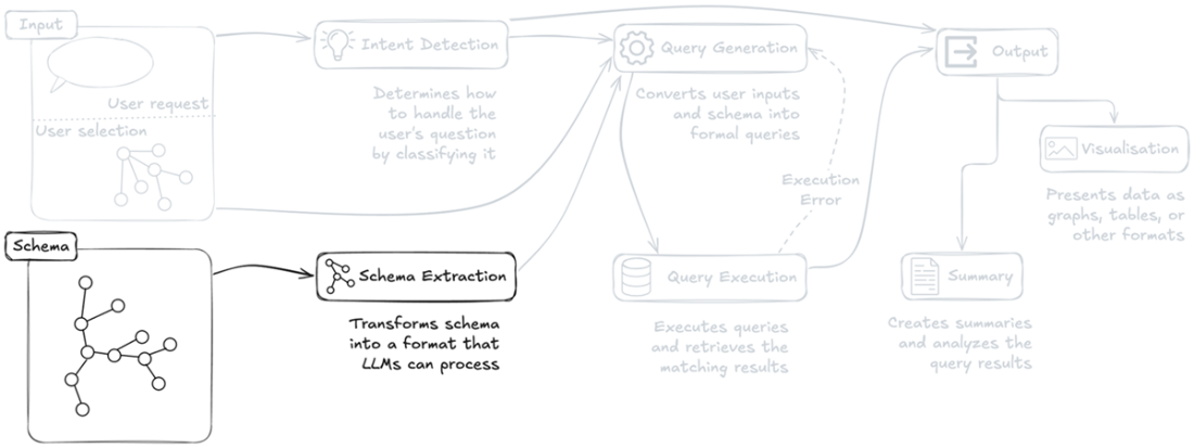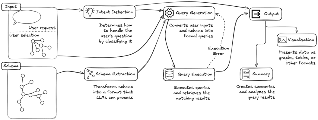 Overview of the system highlighting the main components: Intent Detection, Schema Extraction, Query Generation, Query Execution, Visualization and Summary generation. The system processes user questions and selection inputs, while supporting error feedback during query execution.