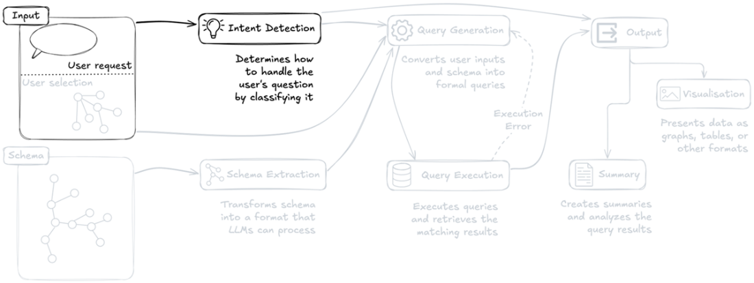 Intent detection routes requests to the right pipeline and output format, improving relevance and visualization. Two layers are common:- Visualization type: graph (default), table (aggregations/stats), chart (distributions), map (locations)