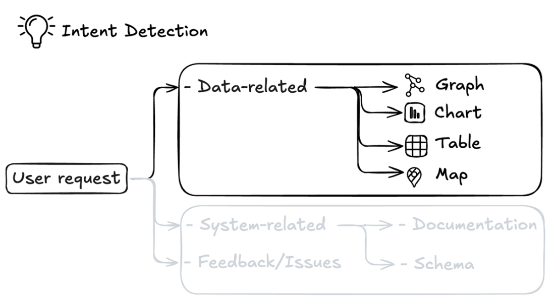 - A well-structured intent detection system requires two layers of classification. The first layer handles broader query categories (data-related, system-related, feedback) while the second identifies the visualization needs.