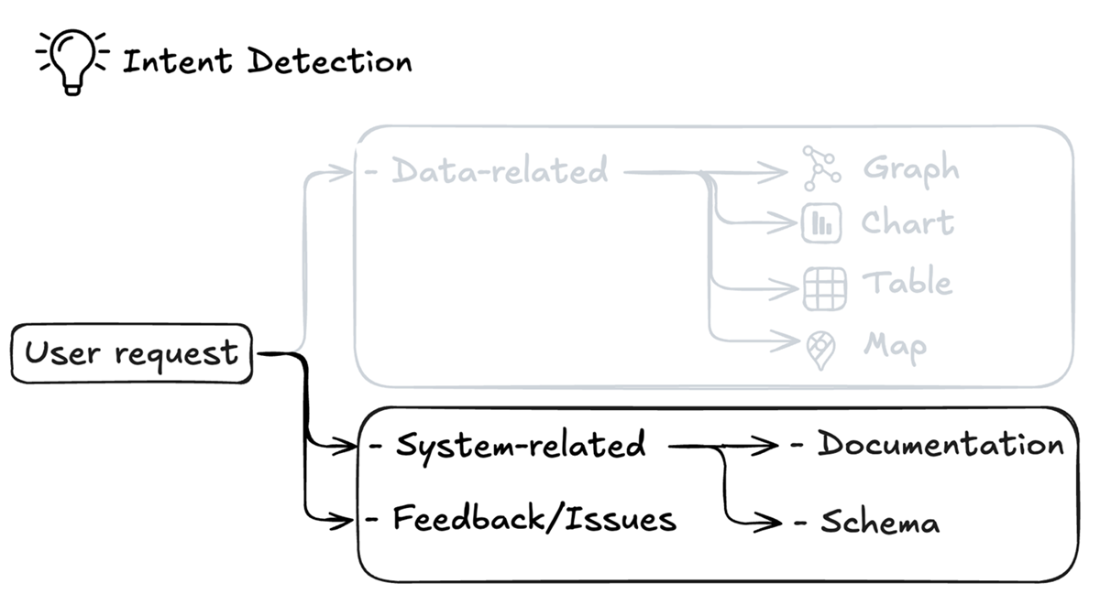 Classification of system-related questions in the intent detection system, showing how requests are routed to either documentation (for system functionality and feature questions) or schema (for knowledge graph structure queries). The system also identifies feedback and issues as a separate category for user complaints or enhancement requests.