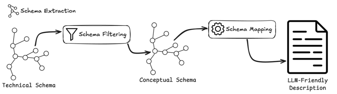 - Converting technical database schemas into LLM-friendly formats involves more than just reformatting - it requires carefully filtering unnecessary elements, adding contextual annotations, and structuring information in ways that align with how LLMs process and understand data.