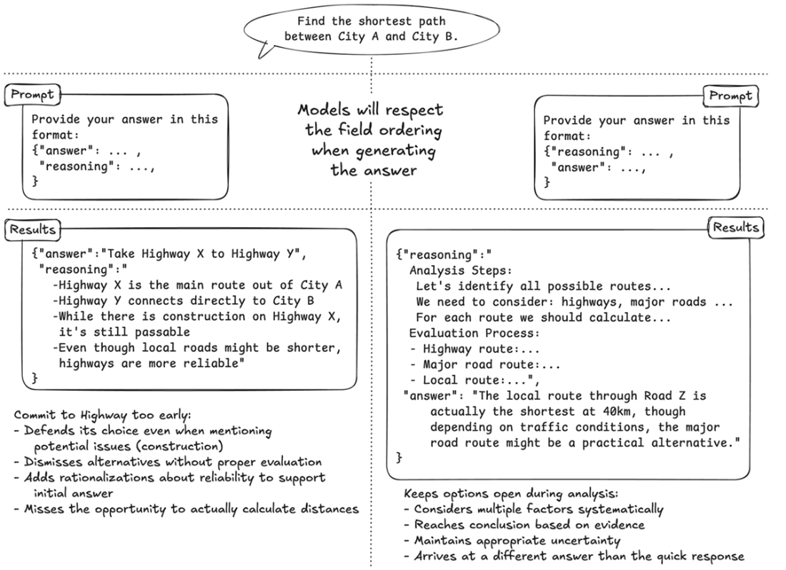 Comparison of two prompt structures for the same path-finding task. Left: The Answer-First approach encourages quick, potentially biased responses with post-hoc justification. Right: The Reasoning-First approach promotes systematic analysis before reaching a conclusion. Note how the JSON structure in each prompt guides the LLM's thinking process.