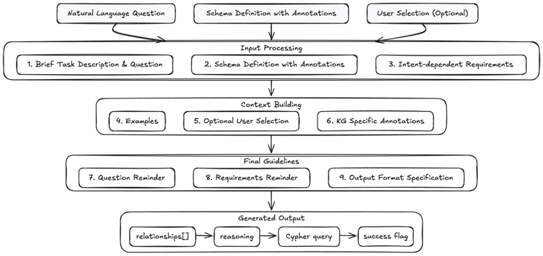 Query Generation Pipeline. The diagram illustrates the complete flow of transforming a natural language question into a Cypher query, showing how three inputs are processed through structured prompt components. The process is organized into three main stages (Input Processing, Context Building, and Final Guidelines) that culminate in a structured JSON.