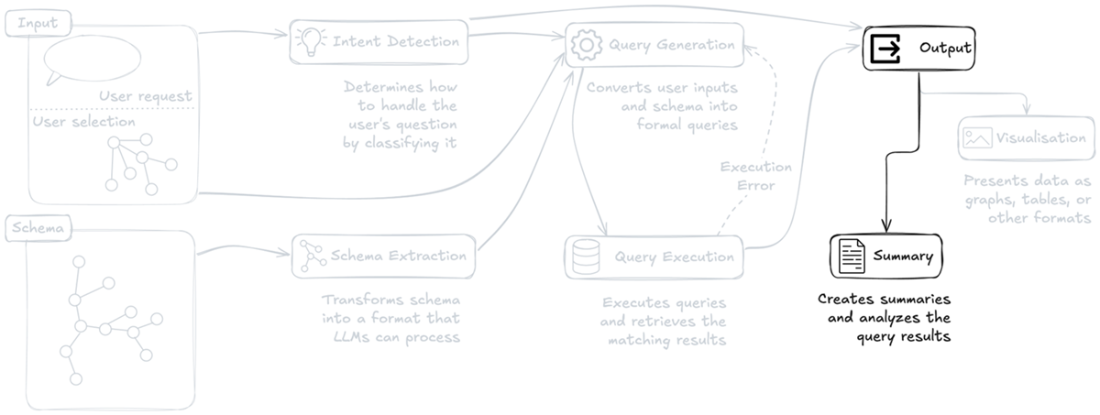 Summarization turns raw query results into actionable insights that complement the visual graph. The prompt:- Provides the original question, executed query, results, and (optionally) current selection
