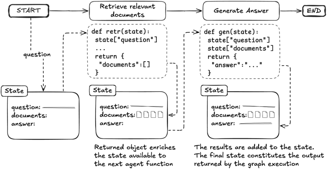 State-based communication between agent functions in LangGraph. The diagram illustrates how agents remain decoupled while communicating through an evolving state object. Each agent function receives and updates the global state independently.