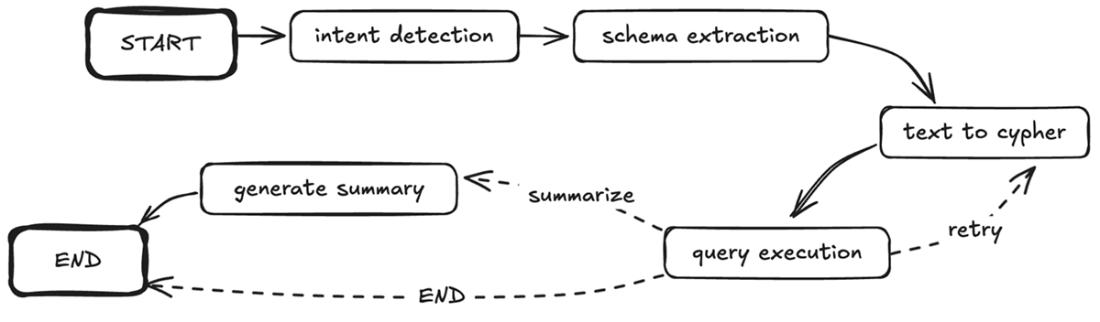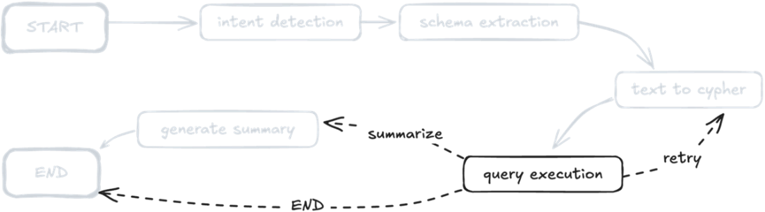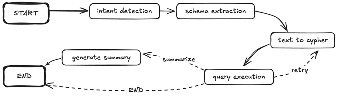 LangGraph implementation of the knowledge graph querying pipeline. The solid arrows show the main flow from intent detection through schema extraction and query execution, while dashed arrows indicate conditional paths based on query execution outcomes. This directed graph structure directly maps each component of our expert-emulated approach to a LangGraph agent function.