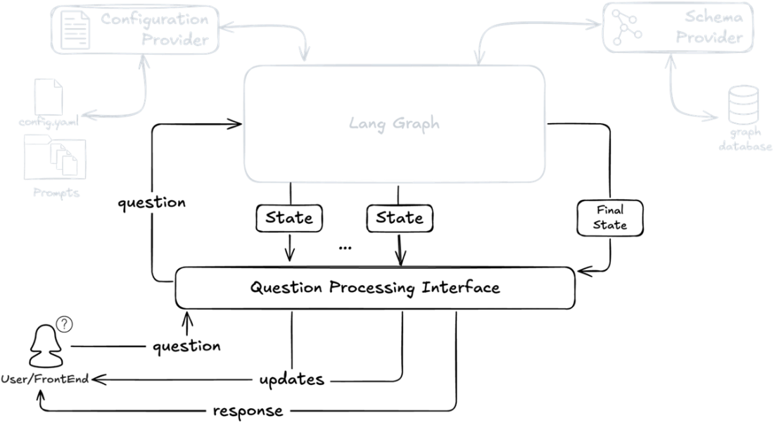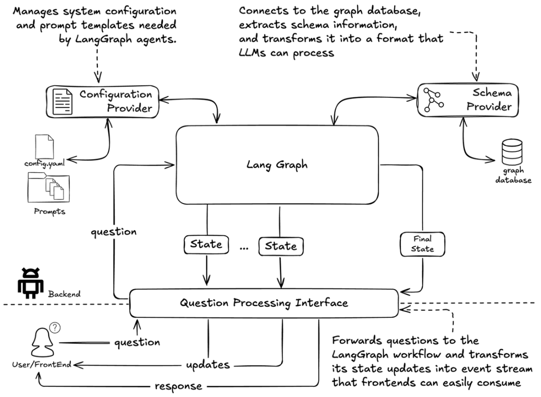 Backend architecture showing how the LangGraph pipeline integrates with supporting components. The Configuration Provider manages prompts and settings, while the Schema Provider handles database schema access. The Question Processing Interface bridges the core pipeline with frontend applications through an event-based API.