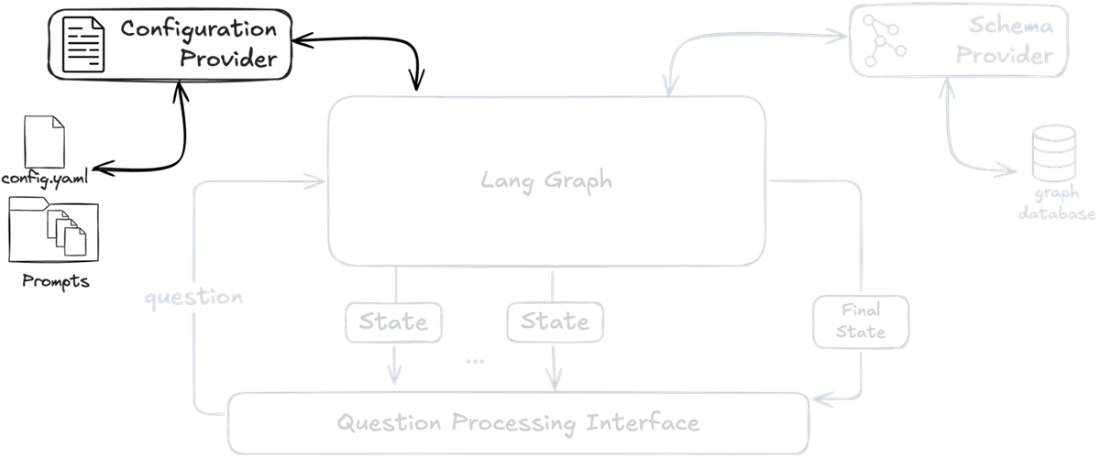 System architecture diagram highlighting the Configuration Provider component. The provider manages system configuration and prompt templates needed by LangGraph agents to process user questions.