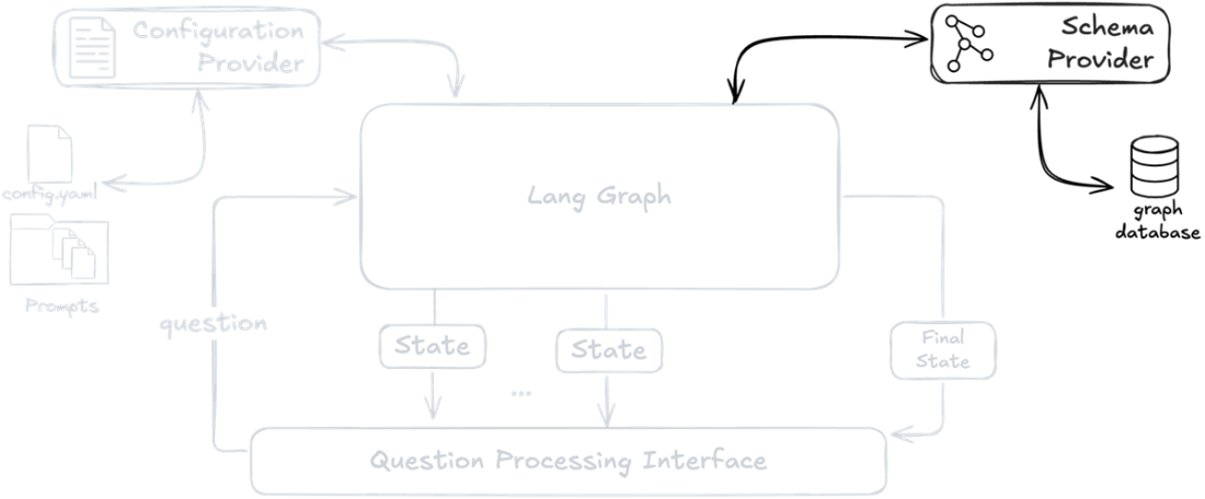 System architecture diagram emphasizing the Schema Provider component, which connects to the graph database to extract and transform technical schema information into LLM-friendly formats.