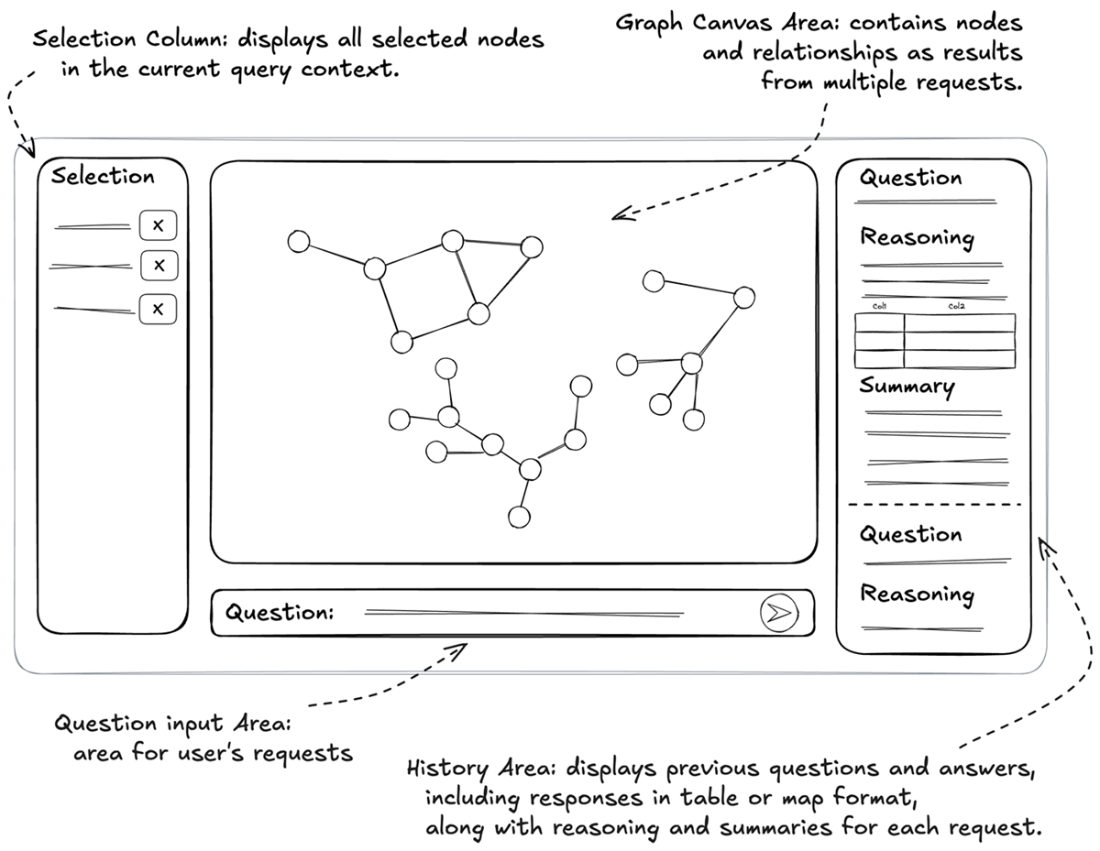 Application interface layout demonstrating a question answering system with selection capabilities, interactive graph visualization, and real-time response tracking