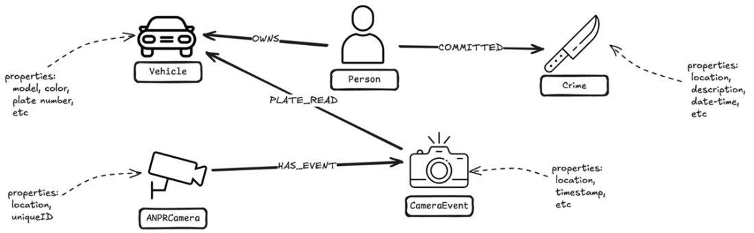 Focused schema visualization showing how Crime, ANPRCamera, CameraEvent, Vehicle, and Person nodes interconnect for investigative queries.